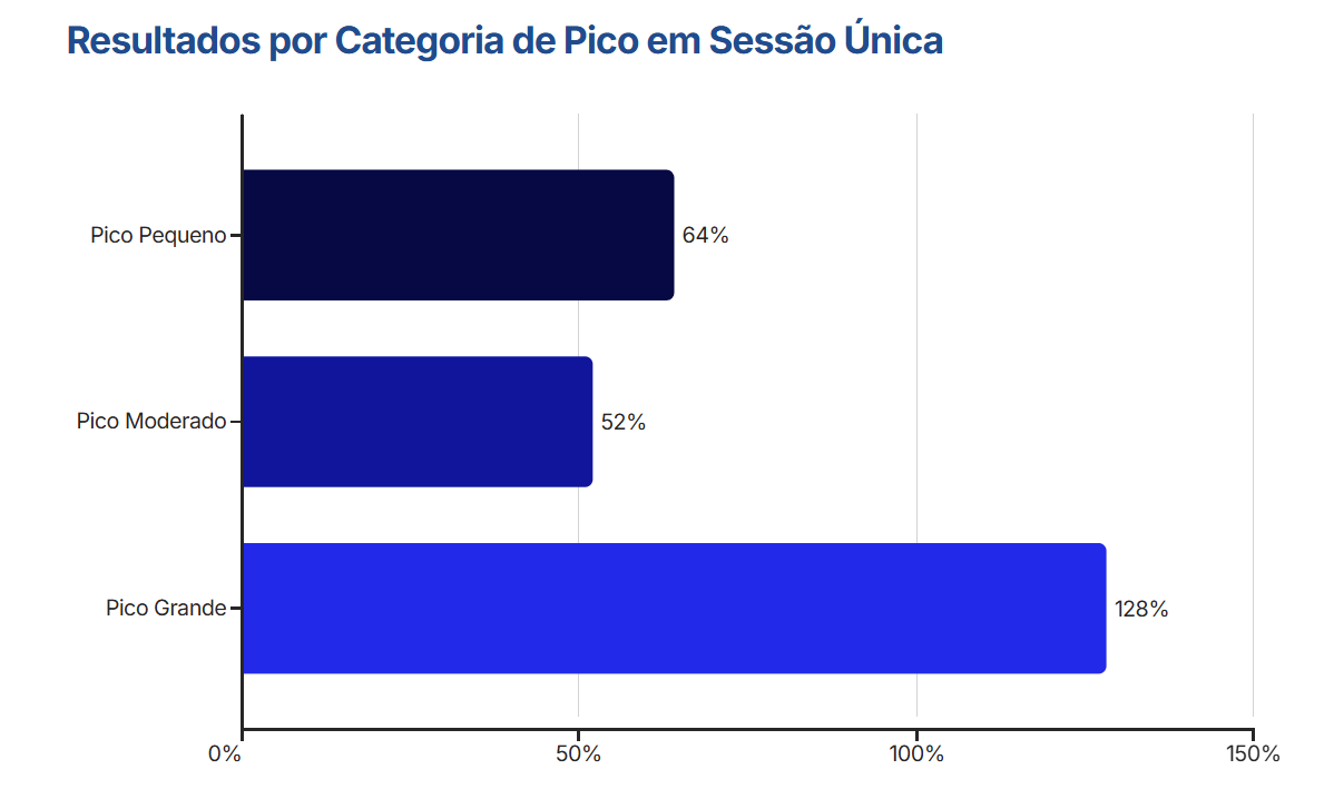 Para picos grandes (>100%), a taxa de risco (HRR) foi de 0.75, indicando um efeito protetor aparente. Isso significa que aumentos semanais na carga total foram associados a menor risco de lesão — um resultado contraintuitivo que desafia décadas de recomendações.