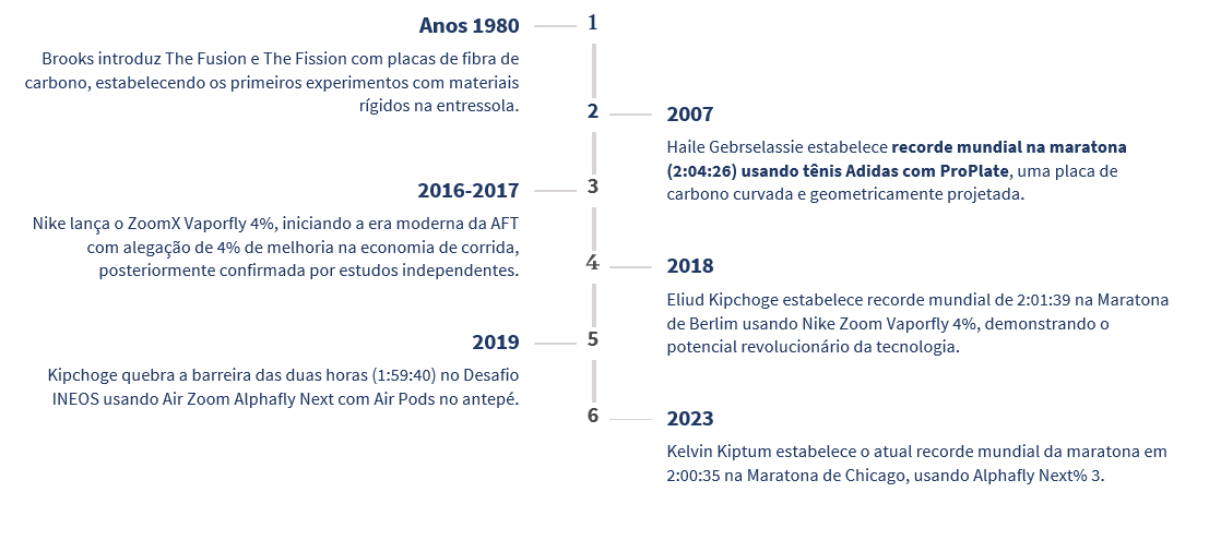 Embora a AFT seja um fenômeno recente, o uso de placas de fibra de carbono em calçados de corrida remonta à década de 1980. O desenvolvimento desta tecnologia passou por marcos importantes que estabeleceram as bases para a revolução atual no design de calçados de corrida.