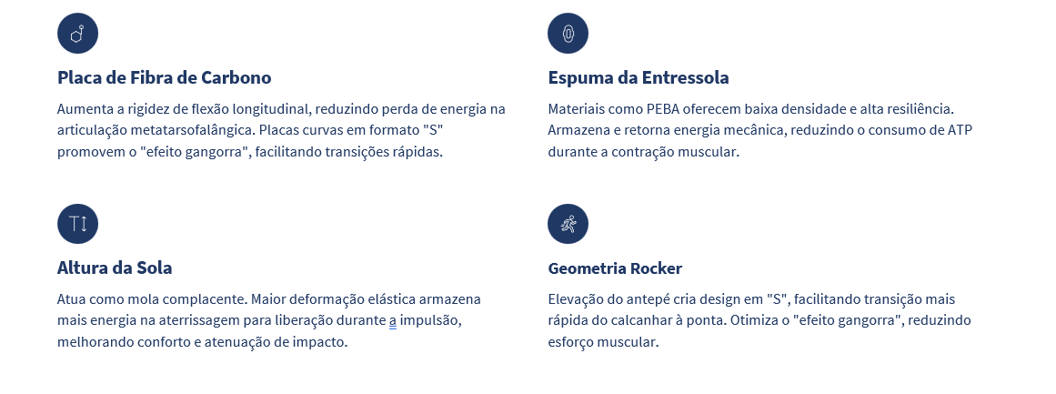Benefícios surgem da interação combinada de placa de carbono, espuma, altura da sola e geometria, não de componente isolado.
